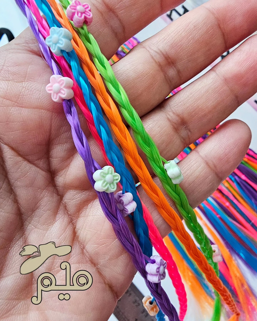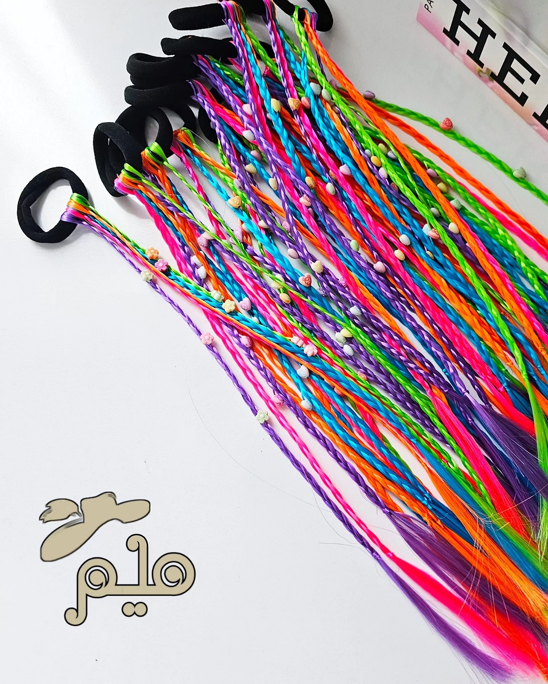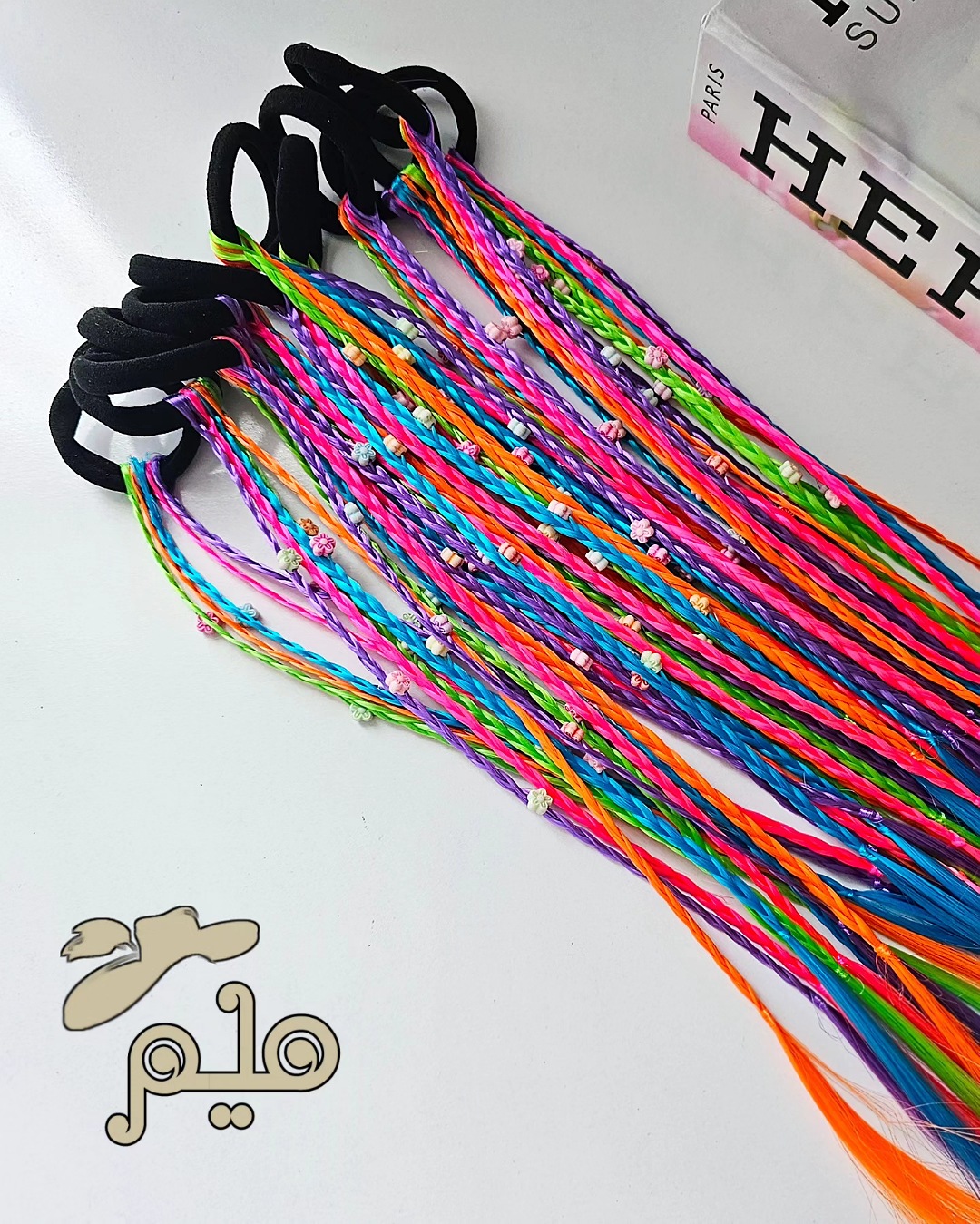 ریسه مو رنگی مهره دار کش مو مشکی، ریسه ها در ۵ رنگ دارای دو مدل مهره، گل و ستاره سایز تقریبی ریسه ۳۰ سانت بدون محدودیت سنی برای حجم موی کم ۱ کش ۵ ریسه ای و برای موهای پرپشت ۲ کش استفاده کنید